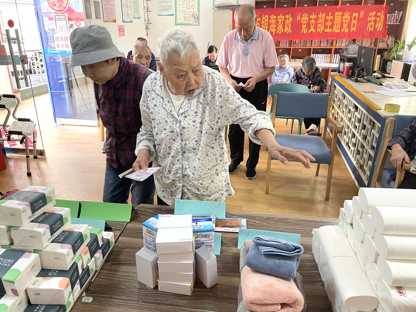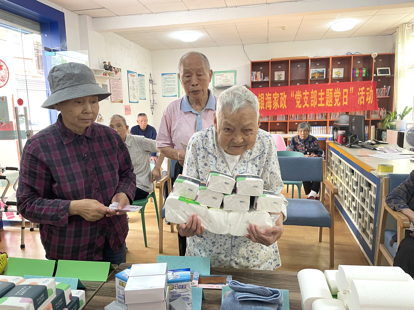 長(zhǎng)者們?nèi)粘5幕顒?dòng)有:擇菜、澆花、養(yǎng)魚、遛鳥、還有各類康樂活動(dòng)、康復(fù)訓(xùn)練等等,他們?cè)?/span>收獲健康、快樂、成就感的同時(shí),也賺到了不少的工資——幸福幣。每個(gè)季度開放一次的幸福銀行兌換日里,爺爺奶奶則可以用自己的“工資”開啟隨心購(gòu)模式,爺爺奶奶們可以用掙到的幸福幣直接在院內(nèi)購(gòu)買生活用品。