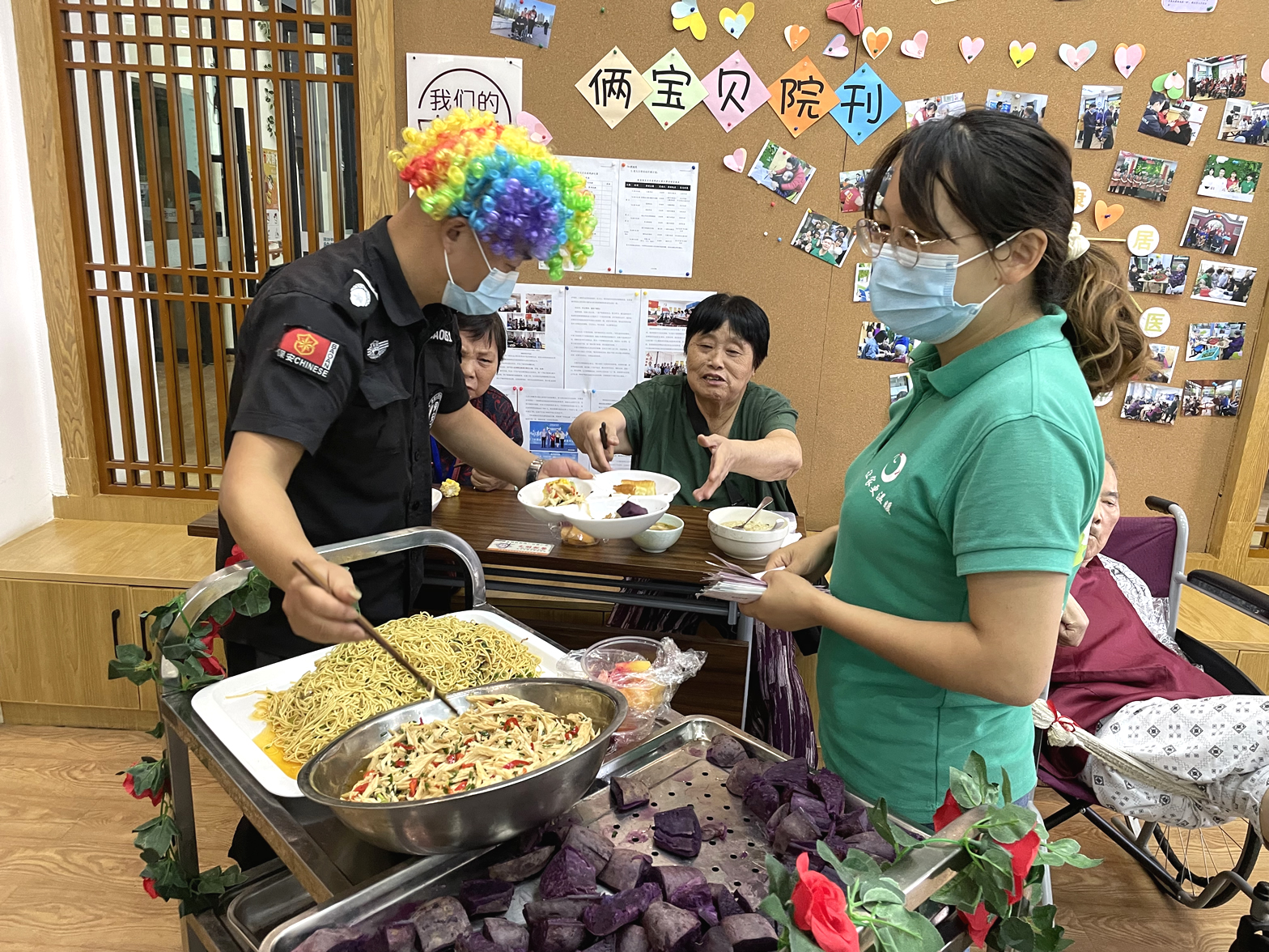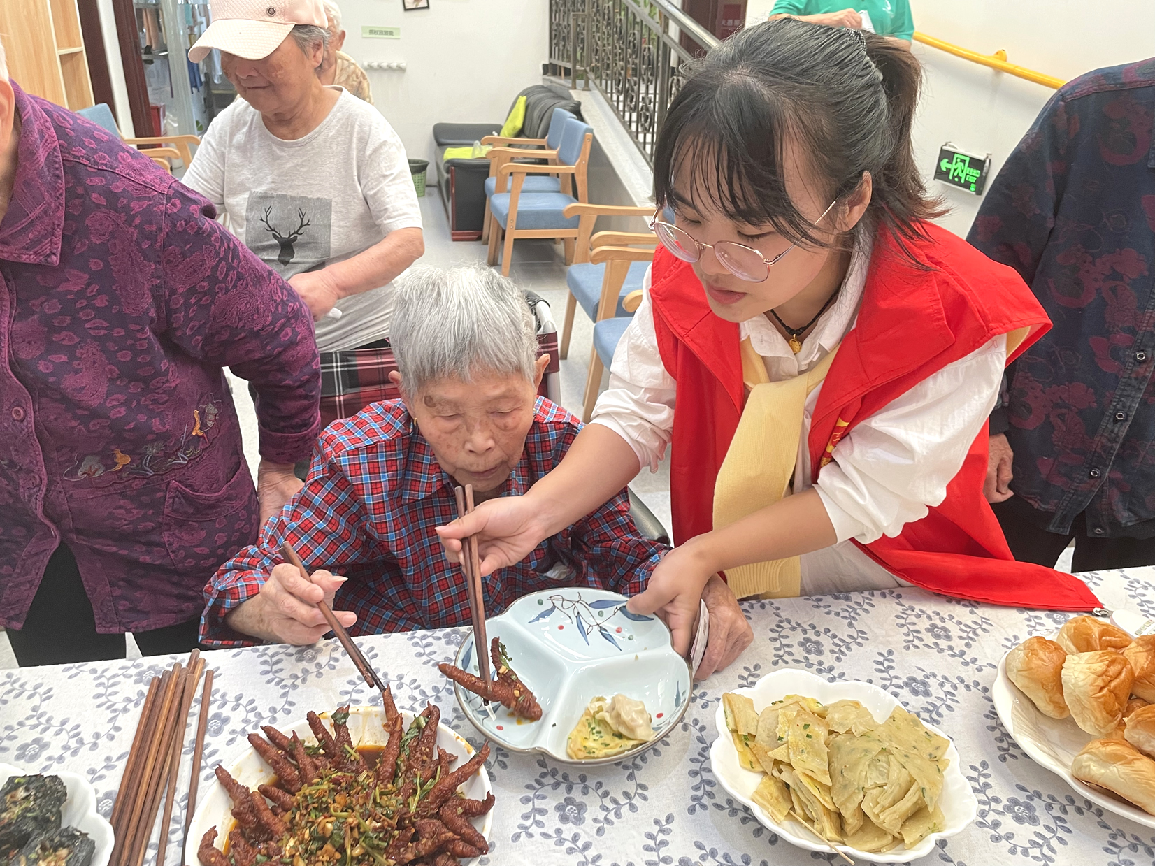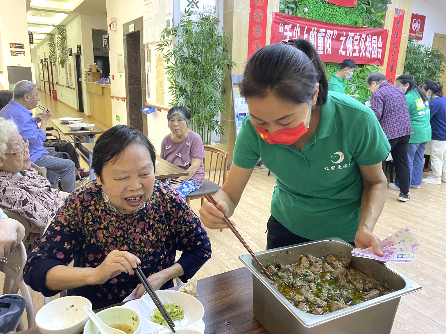 現(xiàn)場(chǎng)食物十分豐富,有重陽(yáng)花糕臭干子、虎皮鳳爪小籠包、餛飩、蒸餃、涼面、炒粉、蒸玉米、紫薯、油條、涼拌菜、水果拼盤等美食陸續(xù)端上來(lái),格外美味的各種小吃,種類繁多,色香味俱全。爺爺奶奶們每天吃食堂的飯菜,時(shí)不時(shí)換點(diǎn)新花樣,都很高興,想吃什么,用手上的幸福幣直接購(gòu)買就行。爺爺奶奶們一邊感受著自己賺錢自己花的快樂一邊品嘗著喜歡的小食,整個(gè)現(xiàn)場(chǎng)其樂融融、熱熱鬧鬧。行動(dòng)不便的爺爺奶奶們也沒關(guān)系,工作人員送到身邊隨他挑選。