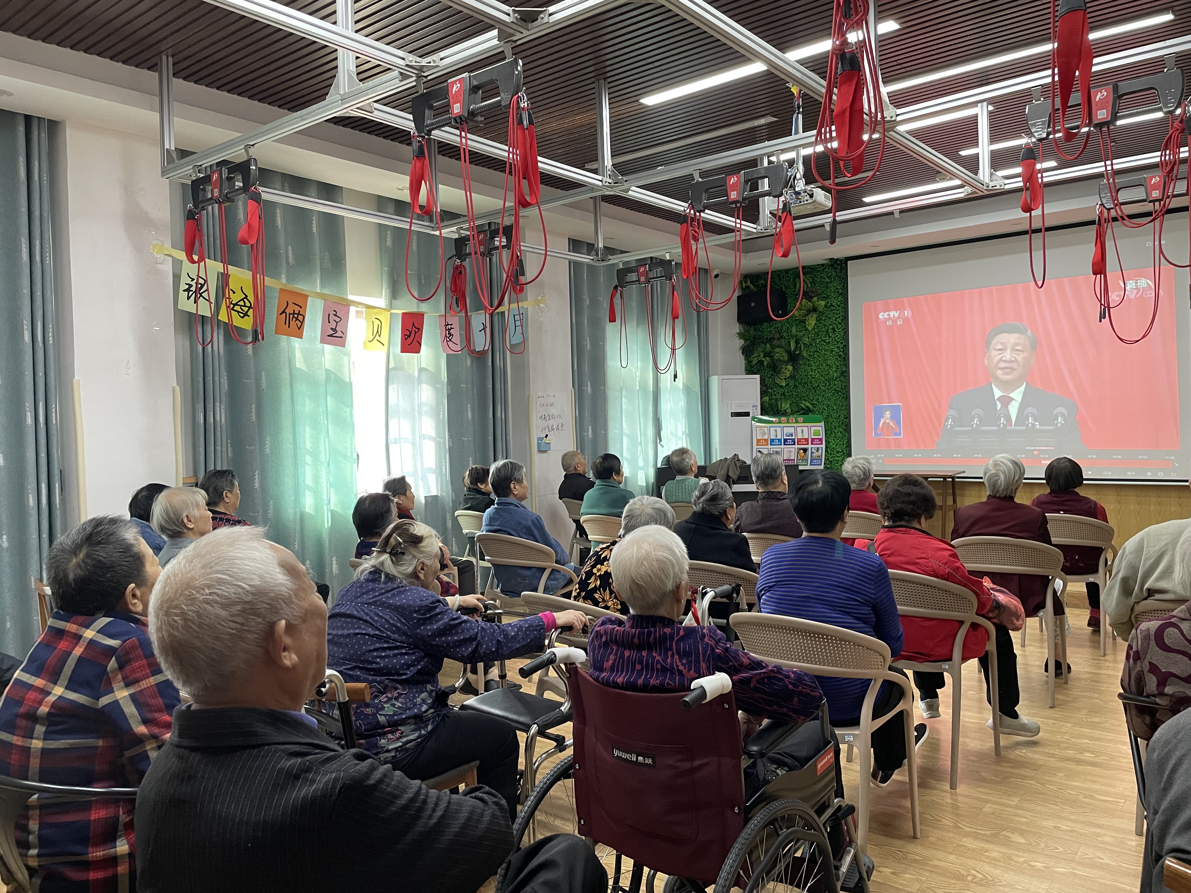 早上,長者們?cè)缭绲膩淼交顒?dòng)室,聚集在電視屏幕前,懷著無比激動(dòng)的心情共同收看了二十大開幕直播。